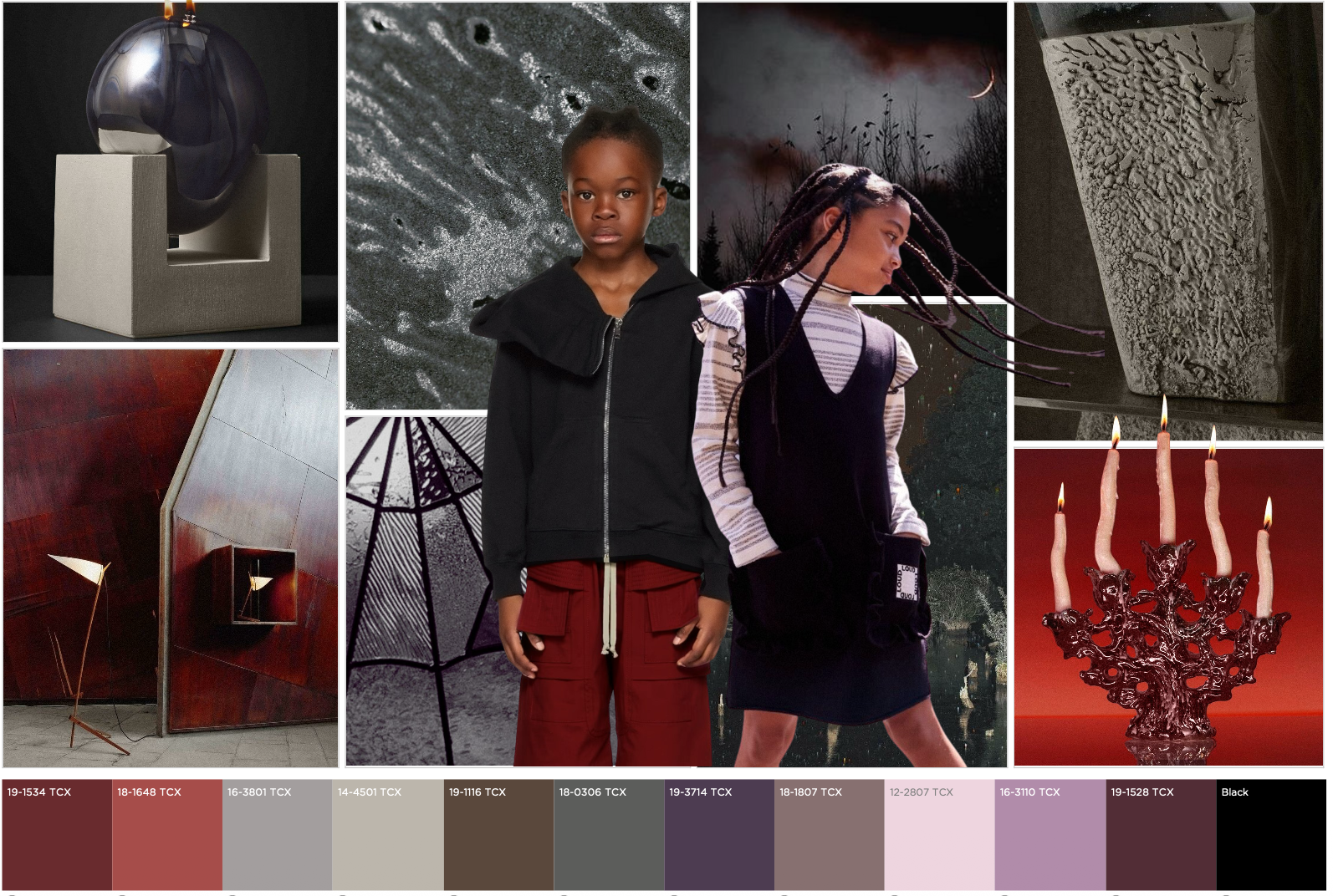 « A reflection of the in-between moment before night overtakes day, the trend Dusk mirrors the delicate balance we seek in life between chaos and control, fear and hope, darkness and light. Its aesthetics confront darkness with a reinterpreted style celebrating the drama and mystery of the goth and punk subcultures, adding elements of hardware, distressed finishes, and intentionally imperfect details that underscore the natural resilience and rebelliousness of children. The colors are dark and moody, with offsets of reds, pinks, and purples that soften the harsh materials and create a harmony between toughness and tenderness. Daring to be different, Dusk’s apparel and accessories showcase authenticity, resilience, and an unapologetic exploration of emotions. »