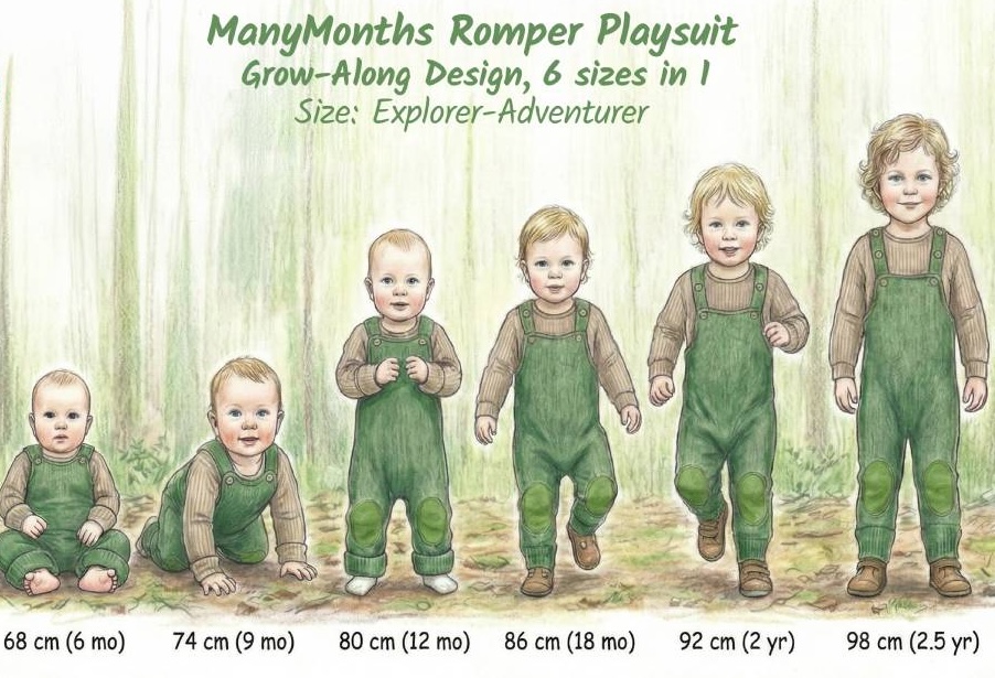 Diagram of how ManyMonths’ garments evolveAs for their grow-along concept, ManyMonths’ sizing is based on developmental stages rather than just height or age. Each category reflects a phase in a child’s physical, cognitive, and emotional development. “This affects proportions, mobility needs, and functional details, not just measurements,” Bettina explained. Using this system, nineteen traditional sizes can be replaced by five to eight ManyMonths garments. This is achieved through small construction details that make all the difference. For example, their Body/Shirts have foldable cuffs and adjustable, removable bottom parts that allow them to be used as shirts later on.