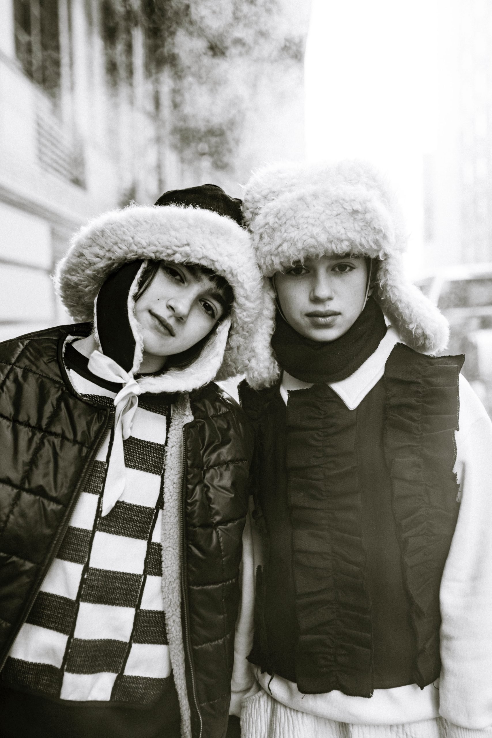 Valentina and Olivia wearing coats and a hat from Louise Misha.